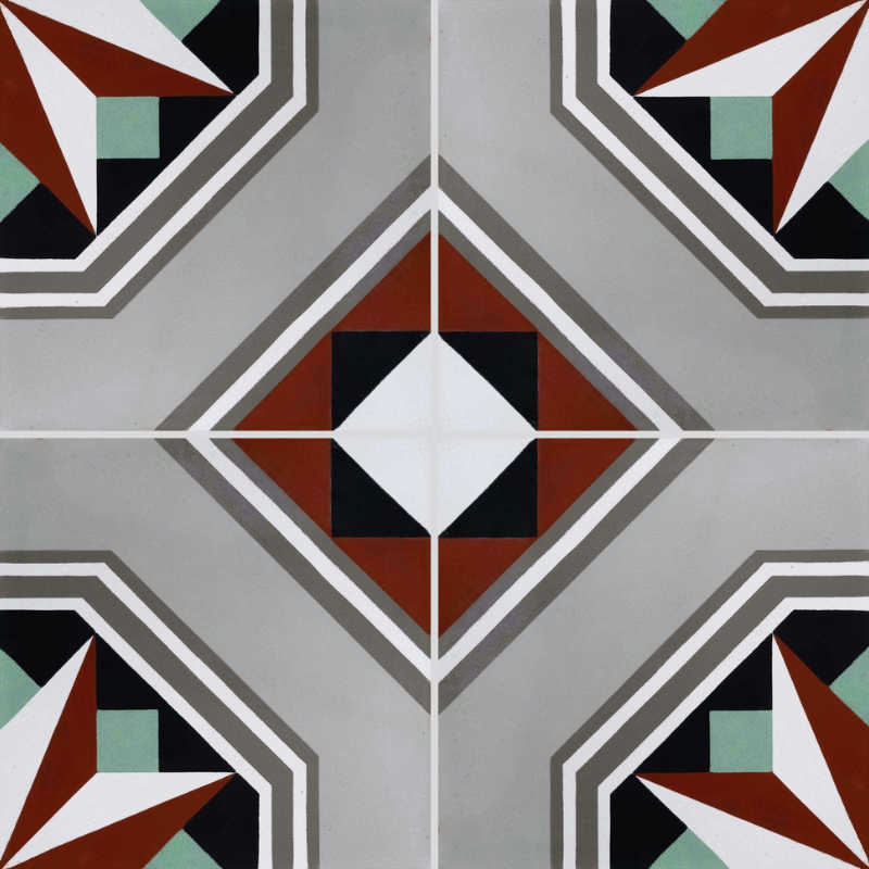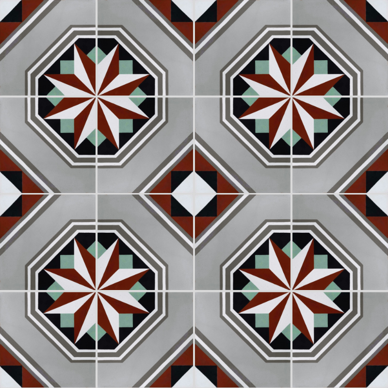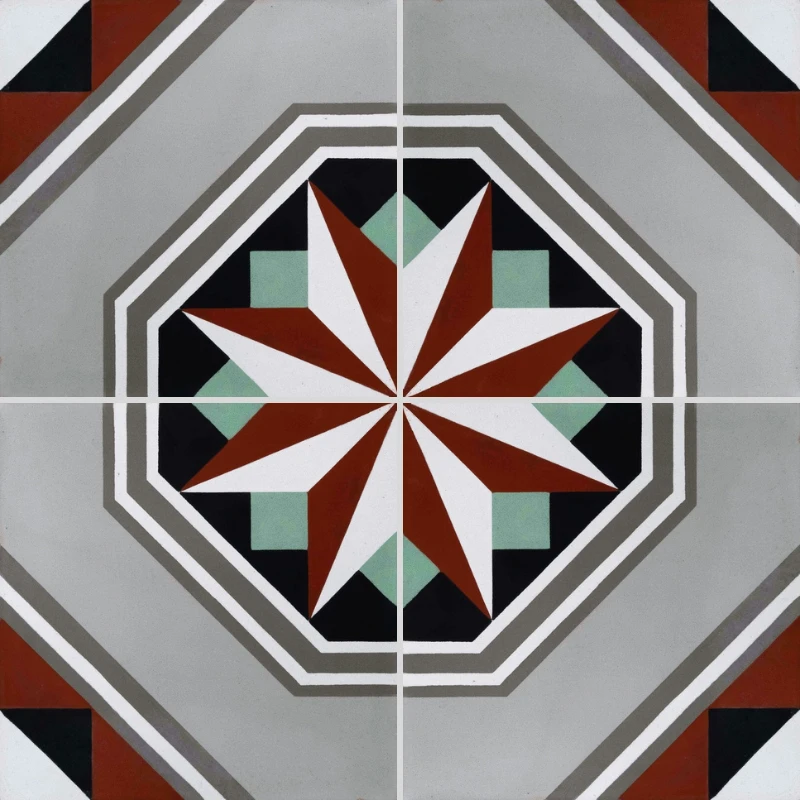 Le carreau de ciment CARODECO 7050-1 se distingue par son superbe motif étoile géométrique centrale inspiré des décors anciens revisités dans un style graphique et sophistiqué. Son association de rouge foncé, gris élégant, blanc lumineux et touches de vert d’eau subtil crée un rendu visuel fort, raffiné et intemporel.