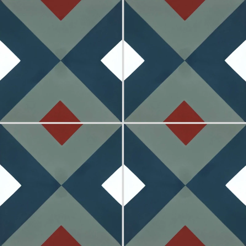 Le carreau de ciment RENEV 4 séduit par son design graphique et contemporain, idéal pour apporter du caractère à vos sols et murs. Son motif géométrique audacieux, composé de losanges contrastés aux teintes bleu profond, vert de gris, blanc et rouge brique, crée un jeu visuel dynamique qui sublime aussi bien les intérieurs modernes que les décorations au charme rétro.