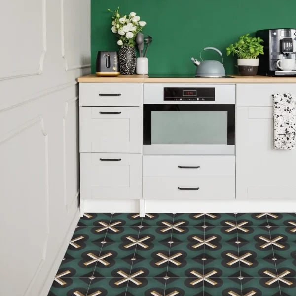 Apportez du caractère à vos espaces avec le carreau de ciment WAX 2, un modèle au design géométrique audacieux et résolument moderne. Son motif structuré mêle des formes en croix stylisées à des nuances profondes de vert, noir et touches dorées, créant un effet visuel sophistiqué et rythmé. Ce carreau de designer peut-être posé de 4 façons différentes pour créer un effet visuel à votre goût.