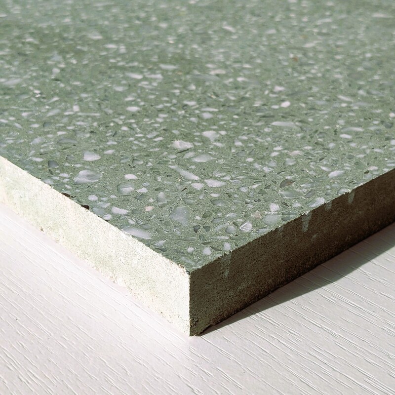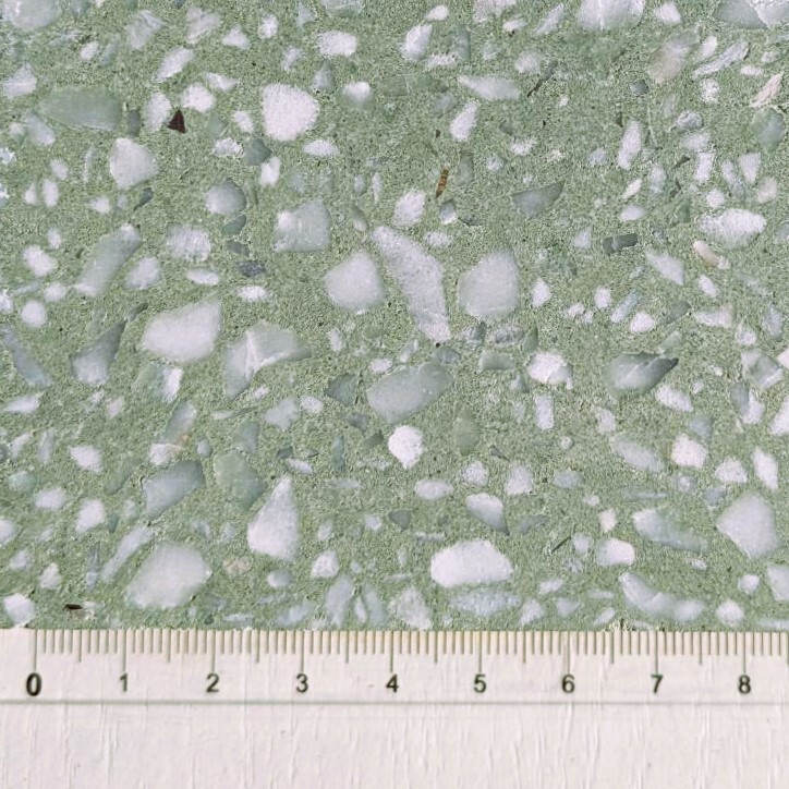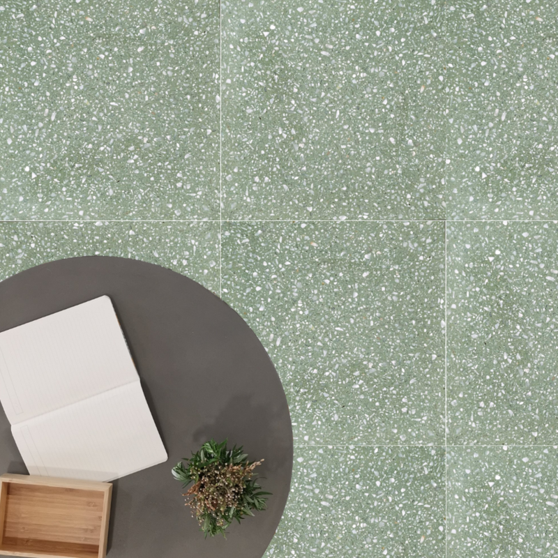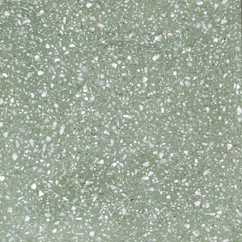 Le terrazzo Bianco Fondo Verde incarne l’élégance intemporelle du terrazzo italien dans une version contemporaine et raffinée. Son fond vert doux, subtilement nuancé, est parsemé d’éclats de marbre blancs et minéraux, créant un effet moucheté à la fois graphique et naturel.